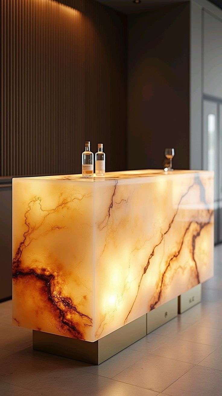 Đá Onyx có thể được dùng làm mặt bàn tiếp khách, quầy bar, bàn trang điểm – tạo điểm nhấn thẩm mỹ cực kỳ ấn tượng.