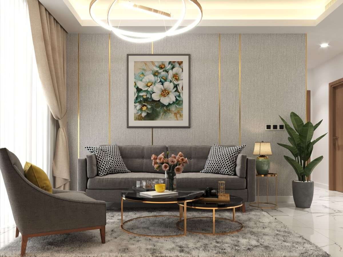 - Tường Điểm Nhấn: Tường phòng khách được ốp giấy dán tường/vải dệt màu xám nhạt với kết cấu (texture) độc đáo, tạo chiều sâu. Các đường phào chỉ vàng chạy dọc tôn lên vẻ cao cấp.