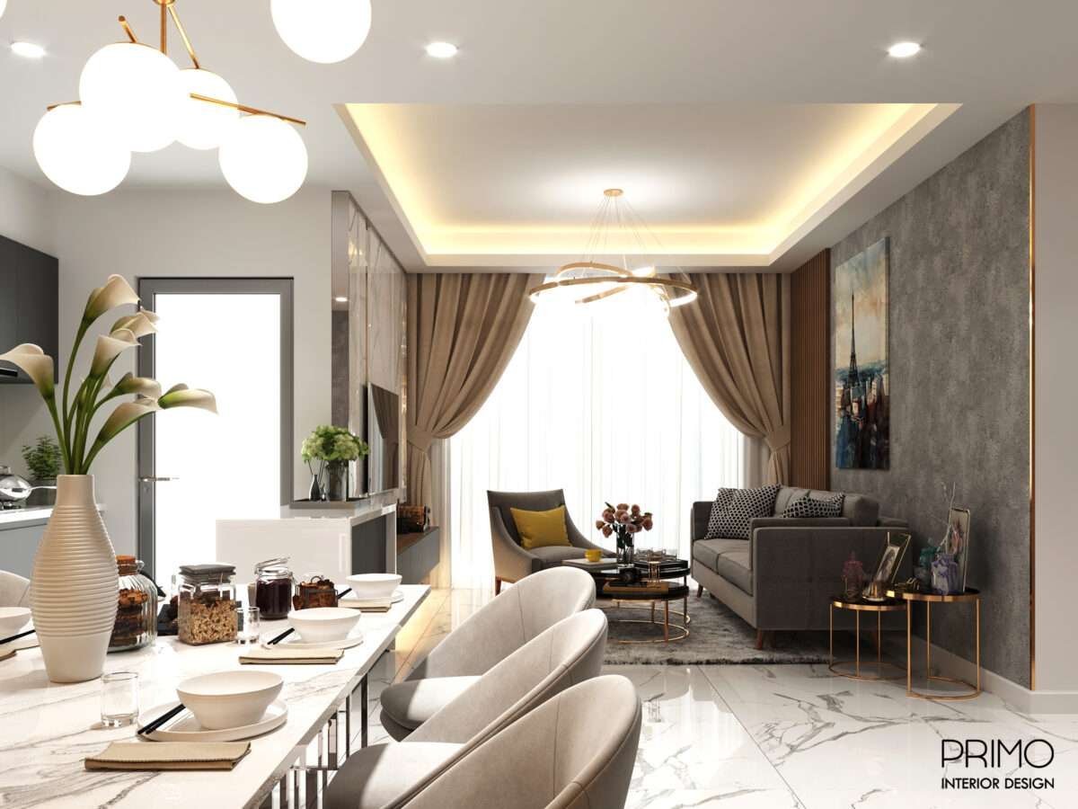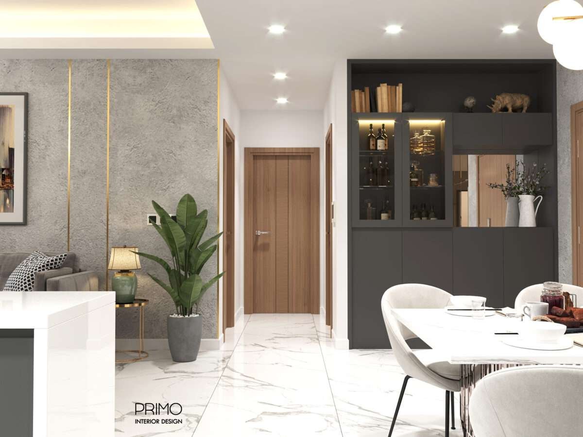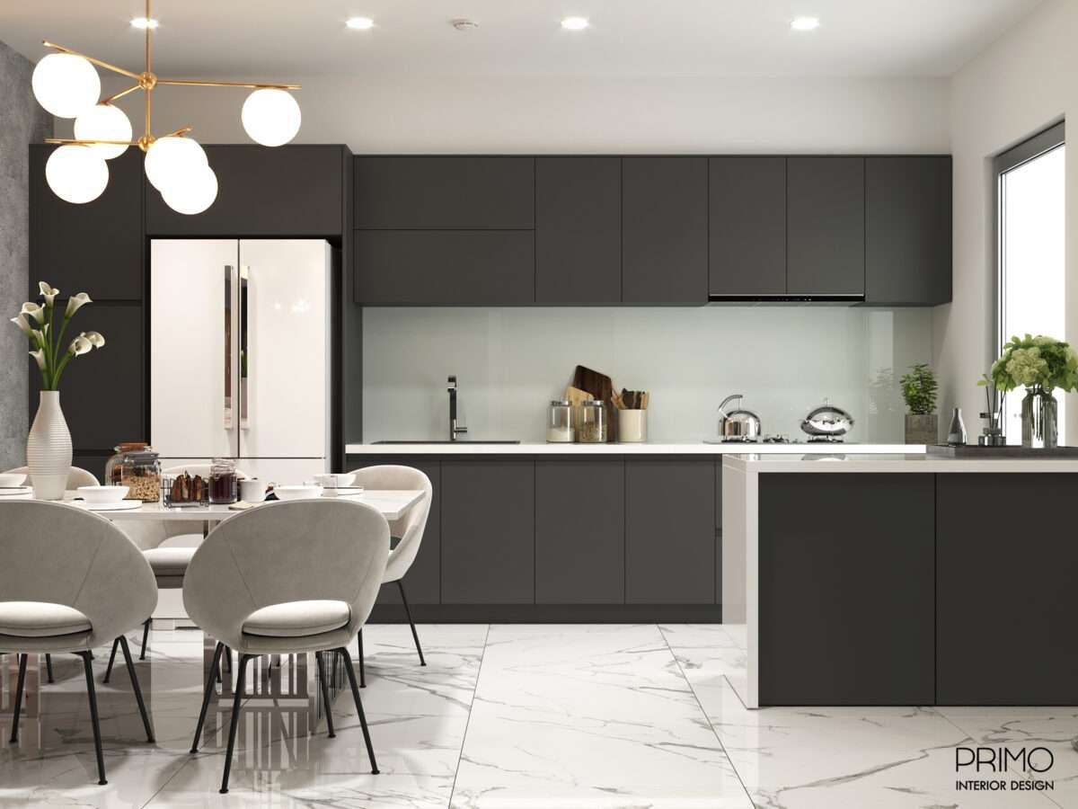 - Bảng Màu Hiện Đại: Tông màu chủ đạo là sự đối lập đầy ý đồ giữa trắng tinh khiết (sàn gạch, đảo bếp, bàn ăn) và xám than chì/đen (sofa, hệ tủ bếp, tủ TV). Sự kết hợp này mang lại cảm giác mạnh mẽ, lịch thiệp và vô cùng thời thượng.