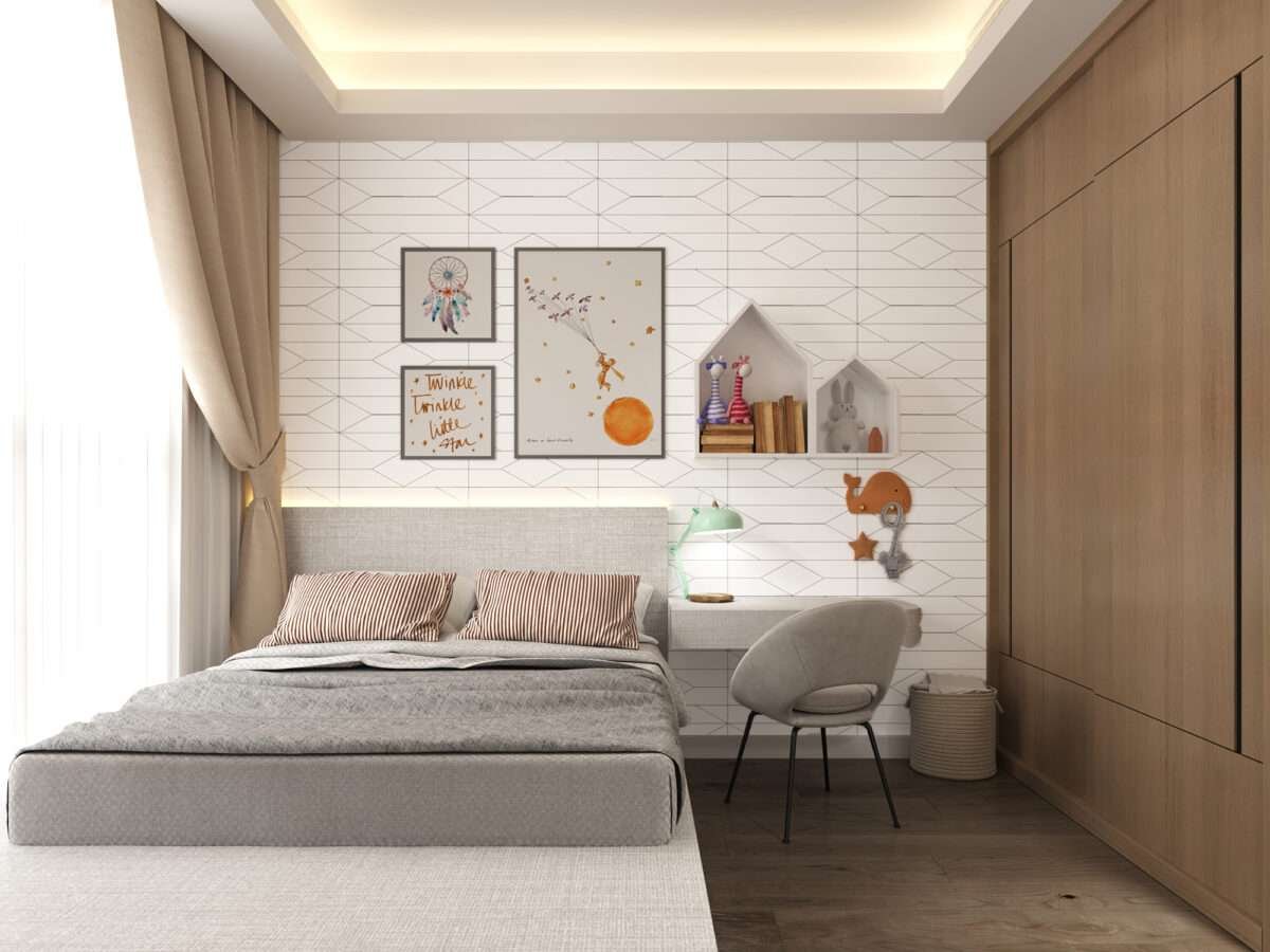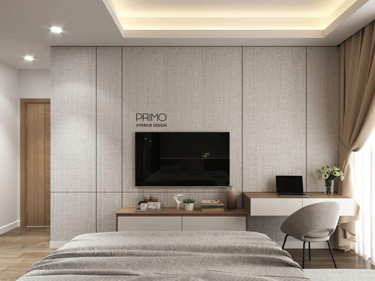 - Khu Vực TV Sang Trọng: Mảng tường TV là sự kết hợp của đá Marble vân xám tự nhiên và vách ngăn trang trí hình học lục giác mạ vàng đồng. Thiết kế này không chỉ là nơi đặt TV mà còn là một tác phẩm nghệ thuật kiến trúc.