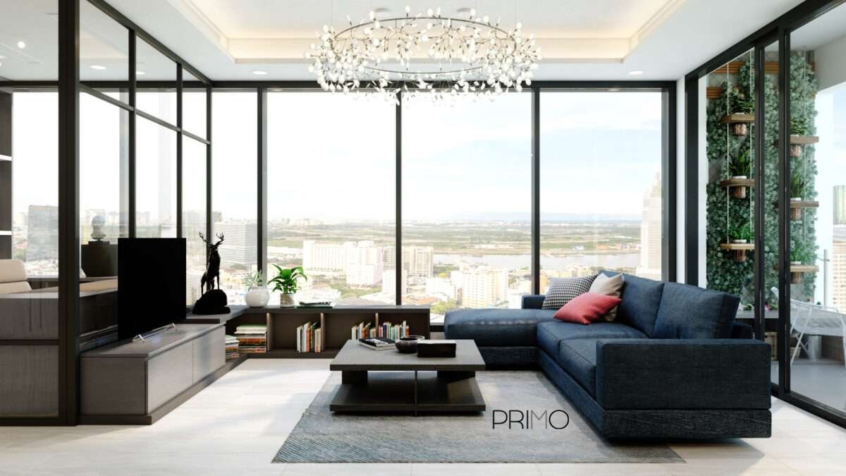 - Ánh Kim Tinh Tế: Đèn chùm hình học lớn (như đèn tròn đồng tâm) hoặc đèn pha lê (như chùm đèn chùm phòng khách view thành phố) và chi tiết kim loại mạ vàng đồng tạo điểm nhấn sang trọng, quý phái.