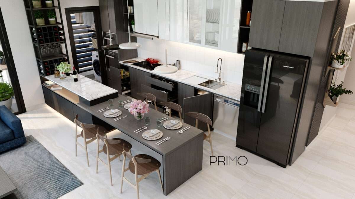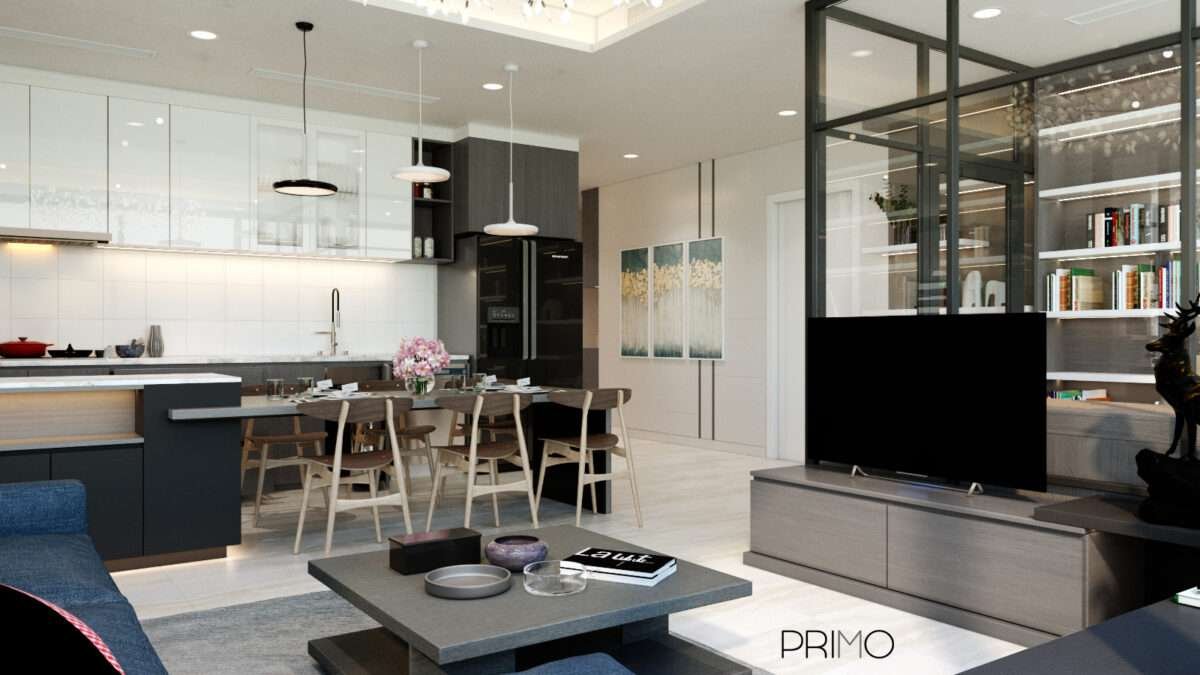 Không gian phòng khách và bếp/ăn được thiết kế mở, rộng rãi, thể hiện sự đẳng cấp và gu thẩm mỹ đa chiều.