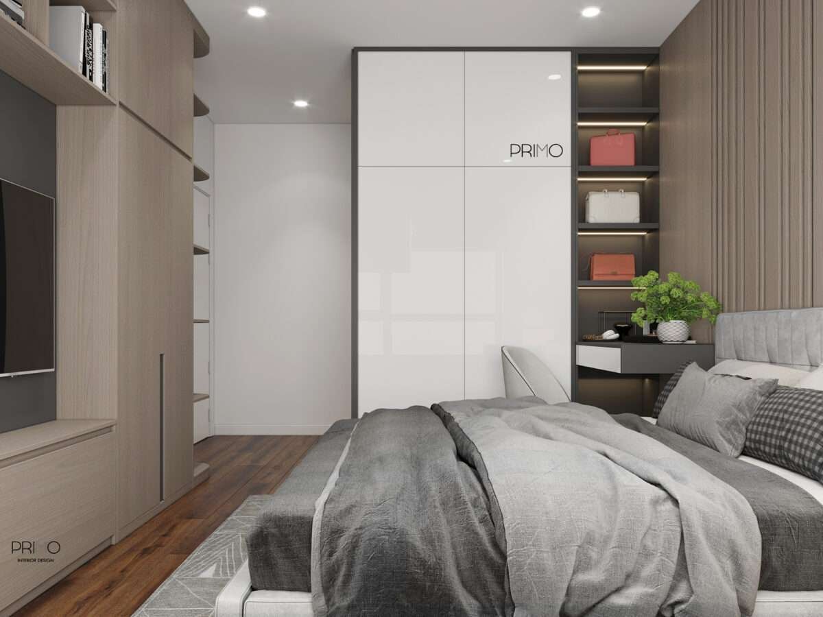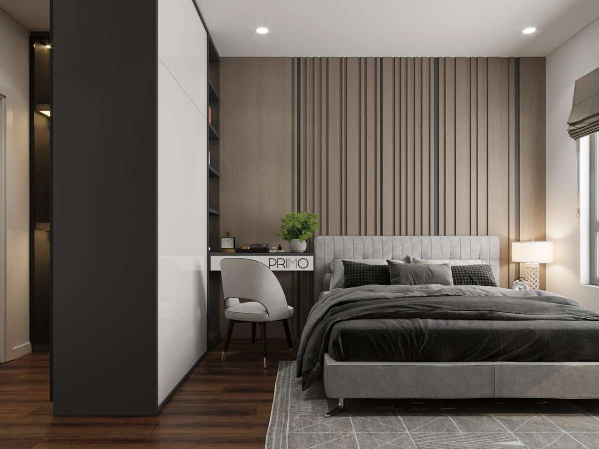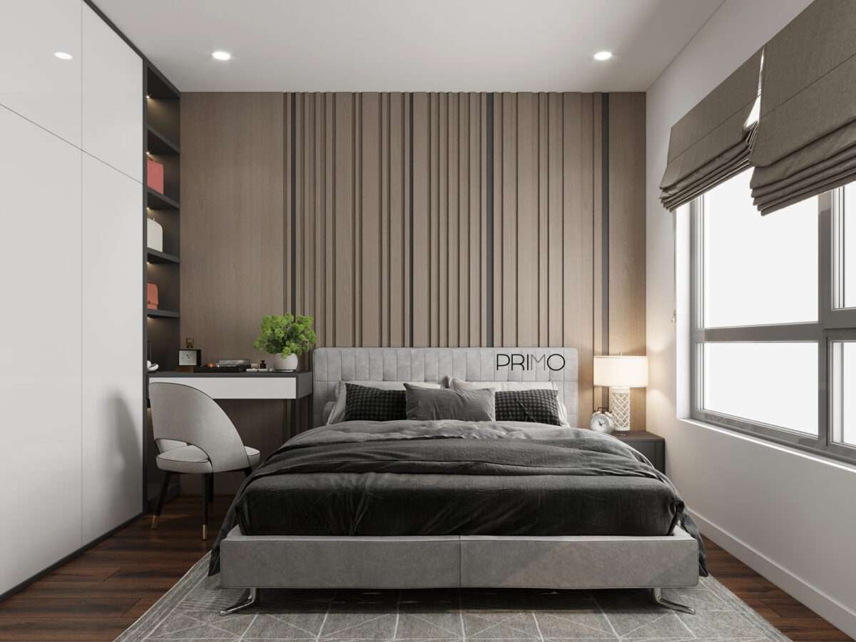 Đầu giường ốp lam gỗ sọc dọc màu nâu ấm. Tích hợp tủ quần áo và bàn làm việc/bàn trang điểm gọn gàng. Màu sắc trung tính (trắng, xám, gỗ nhạt) tạo cảm giác hiện đại, thanh lịch và ấm cúng.