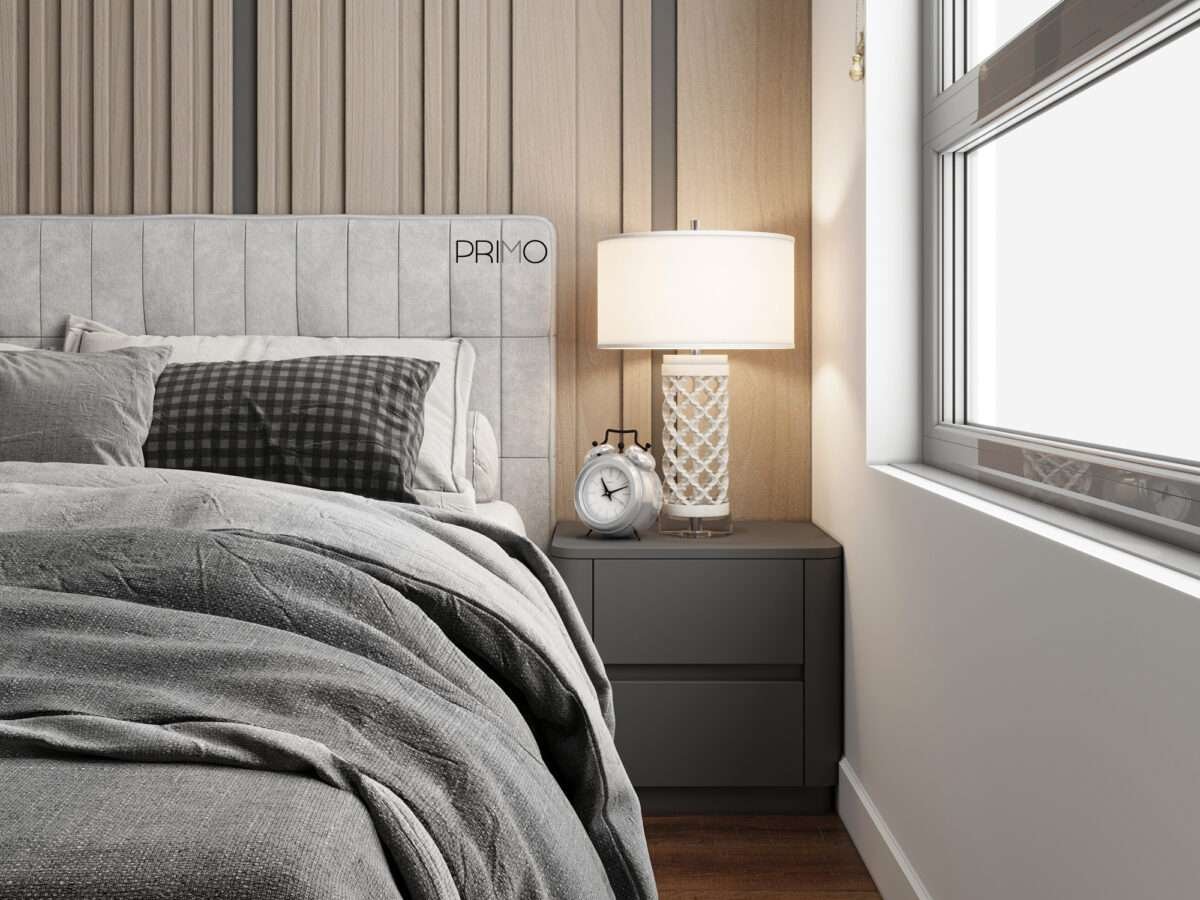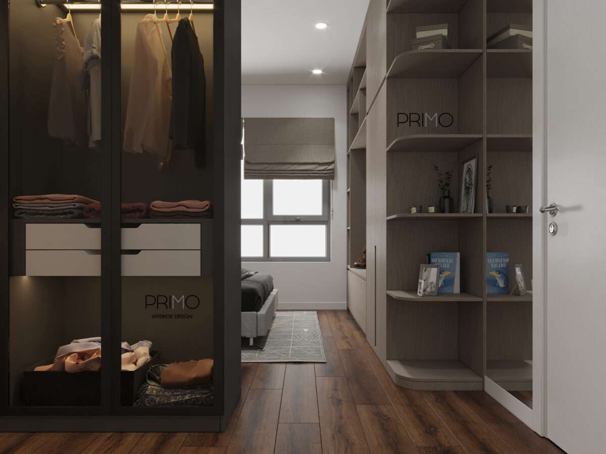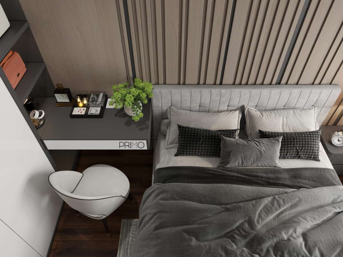 Đầu giường ốp lam gỗ sọc dọc màu nâu ấm. Tích hợp tủ quần áo và bàn làm việc/bàn trang điểm gọn gàng. Màu sắc trung tính (trắng, xám, gỗ nhạt) tạo cảm giác hiện đại, thanh lịch và ấm cúng.