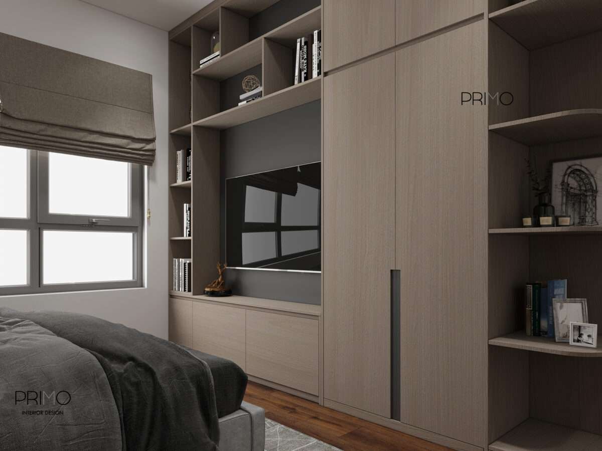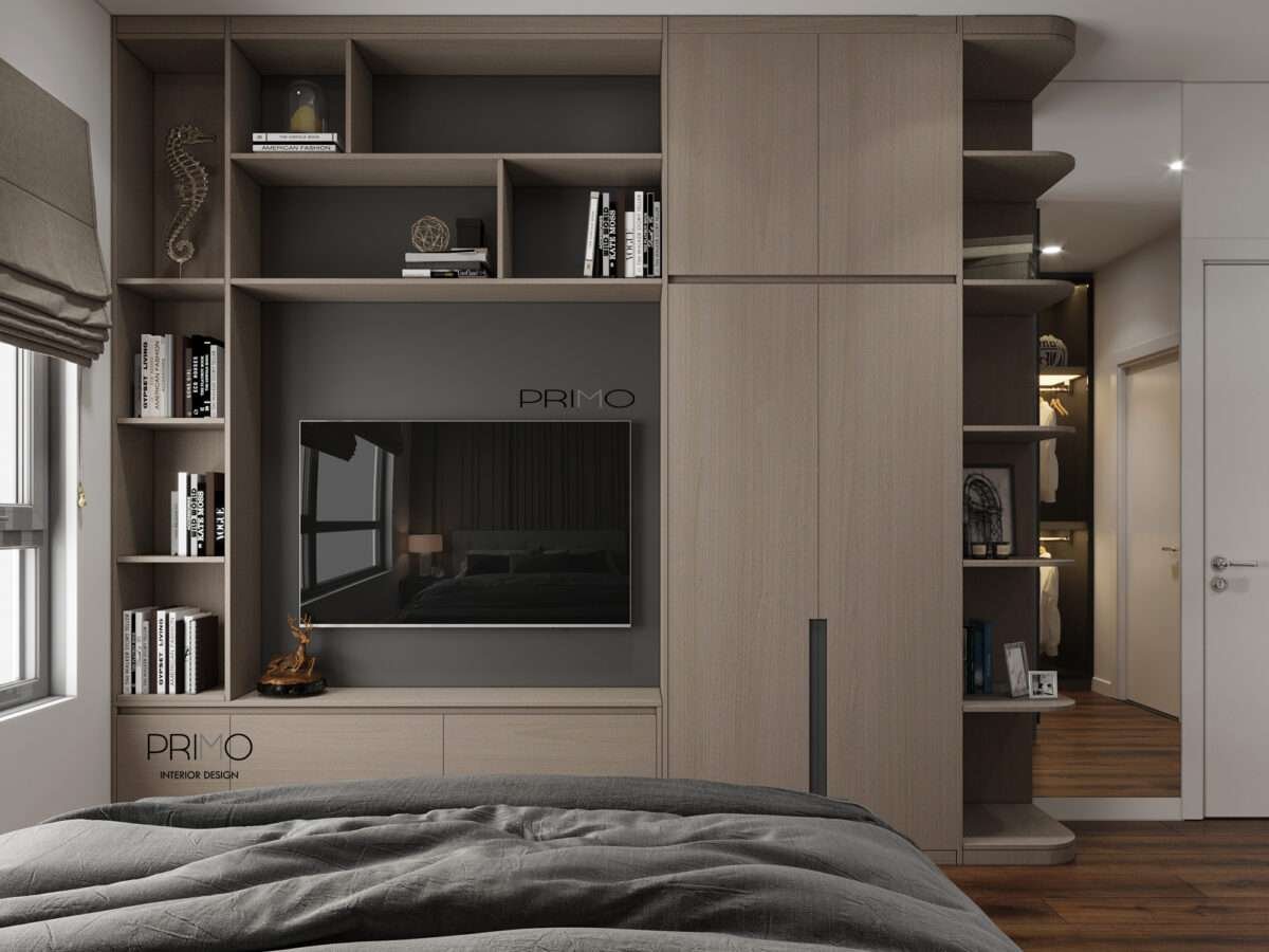 - Công Năng Thông Minh: Tủ kệ TV và giá sách âm tường được thiết kế khoa học, vừa là nơi lưu trữ vừa là khu vực trưng bày nghệ thuật.