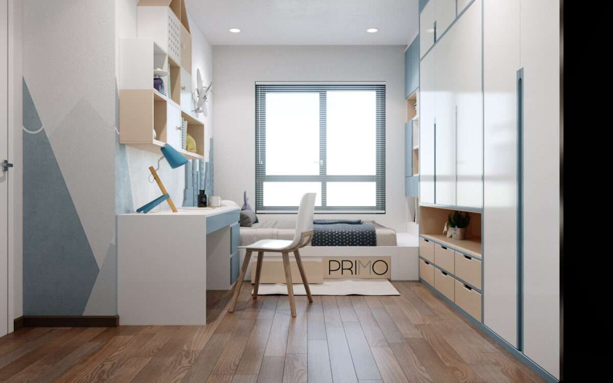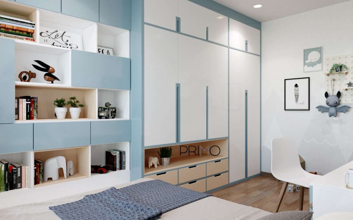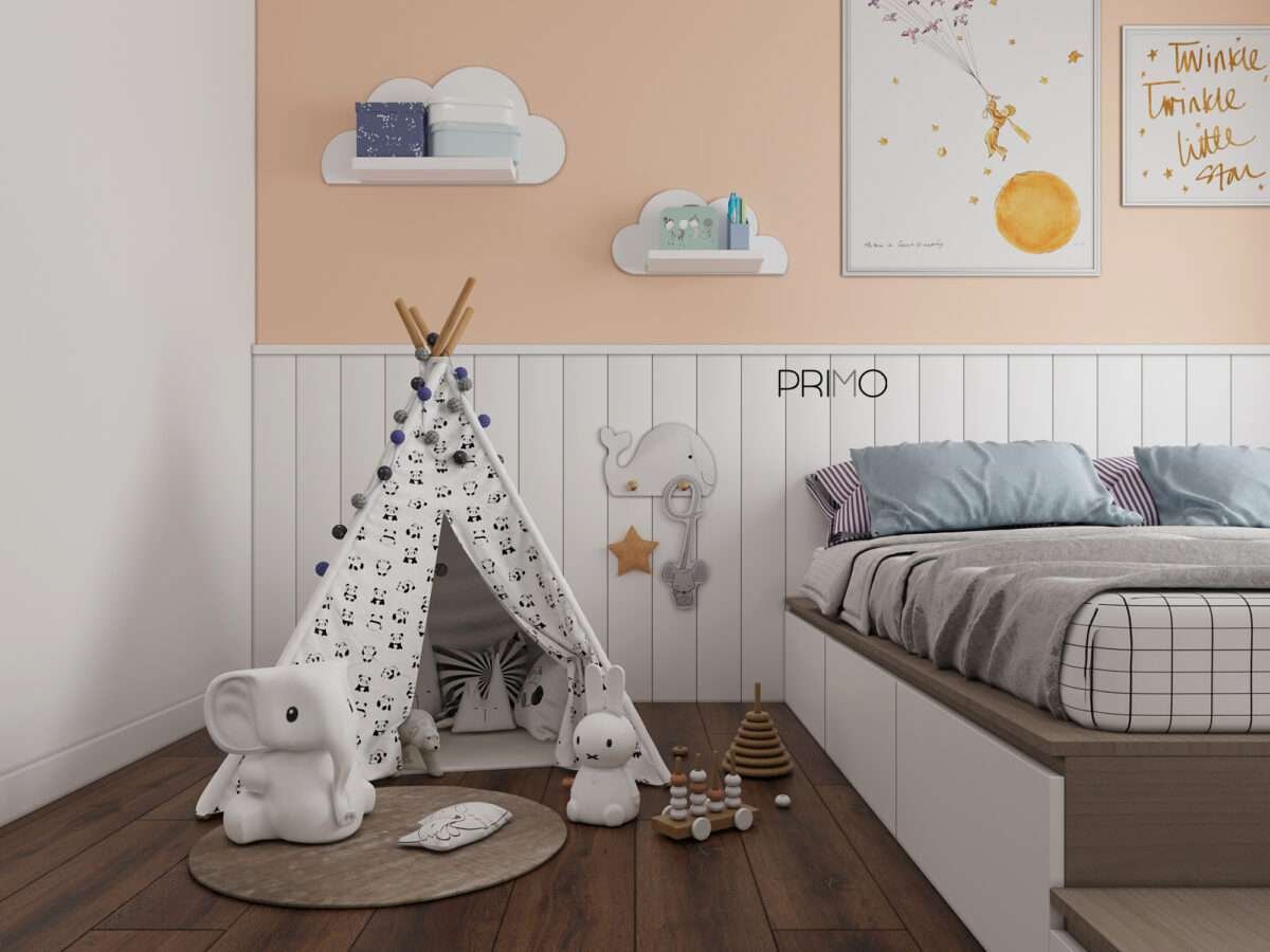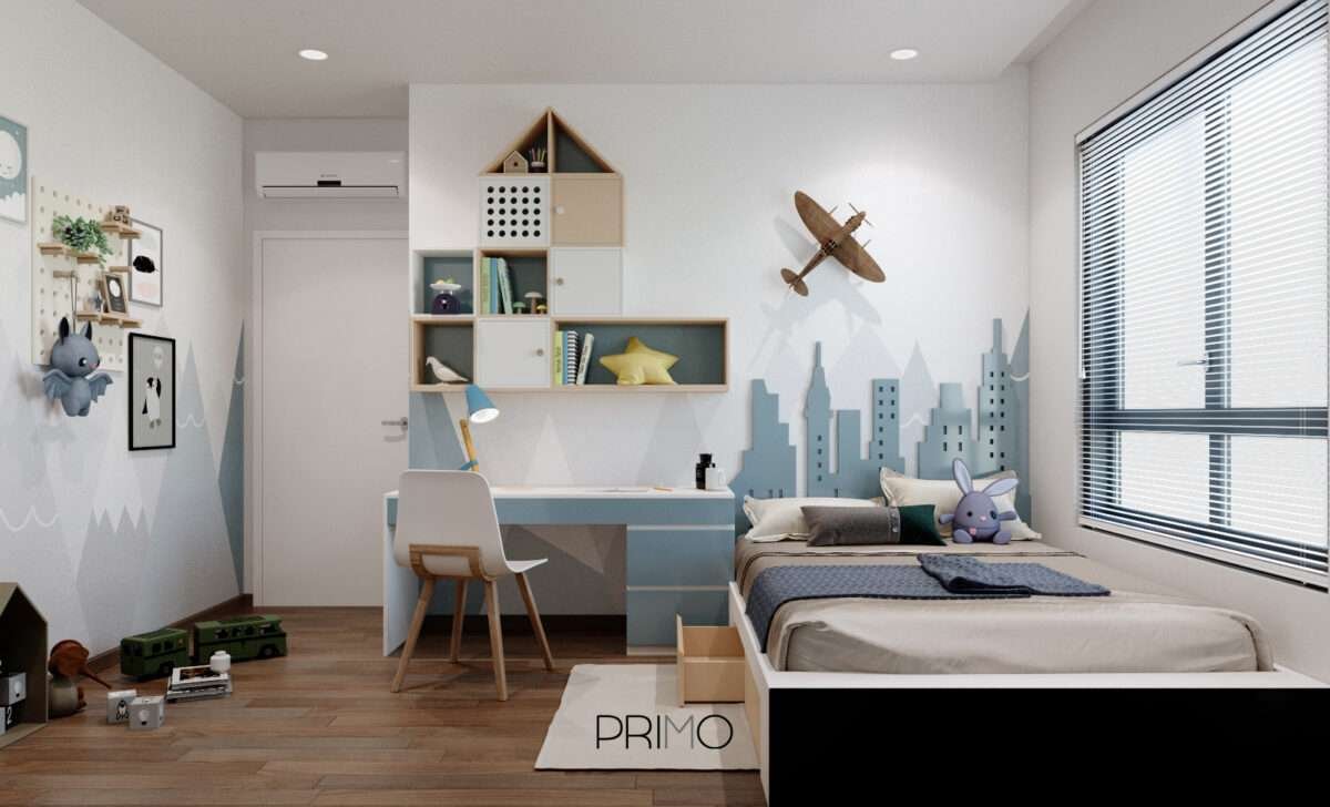 Thiết kế phòng ngủ bé trai nhấn mạnh một không gian sáng tạo, với các ô tủ xen kẽ lệch màu. Mô hình máy bay trên vách CNC mô phỏng thành phố vừa thoả sở thích của bé lại gửi gắm hy vọng của ba mẹ.