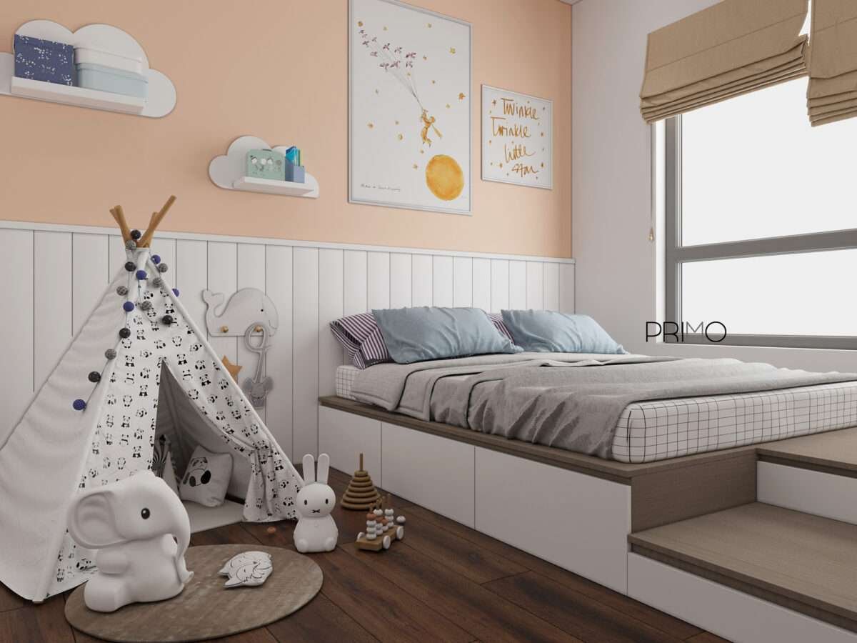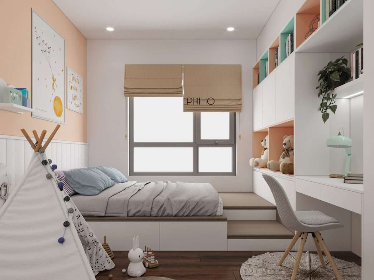 Phòng ngủ bé gái sử dụng tông màu cam đào làm điểm nhấn trên tường, kết hợp với nội thất trắng. Thiết kế tối ưu với bục cửa sổ làm ghế ngồi thư giãn và bàn làm việc gọn gàng, tối đa không gian vừa học vừa chơi.