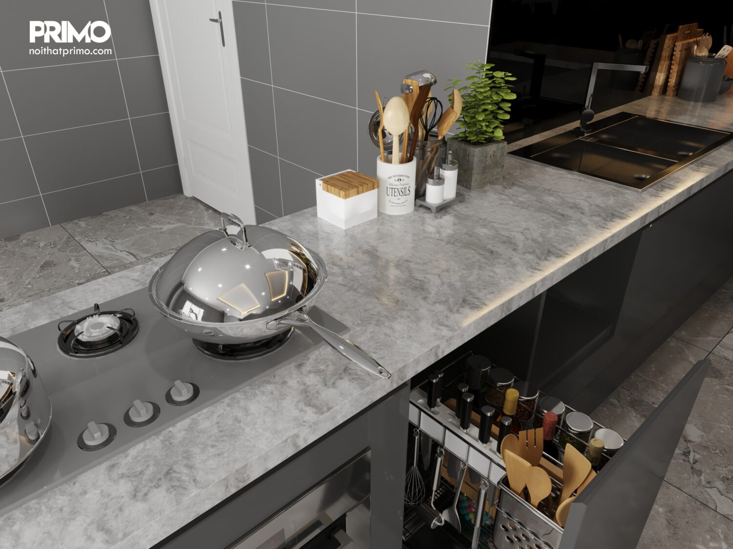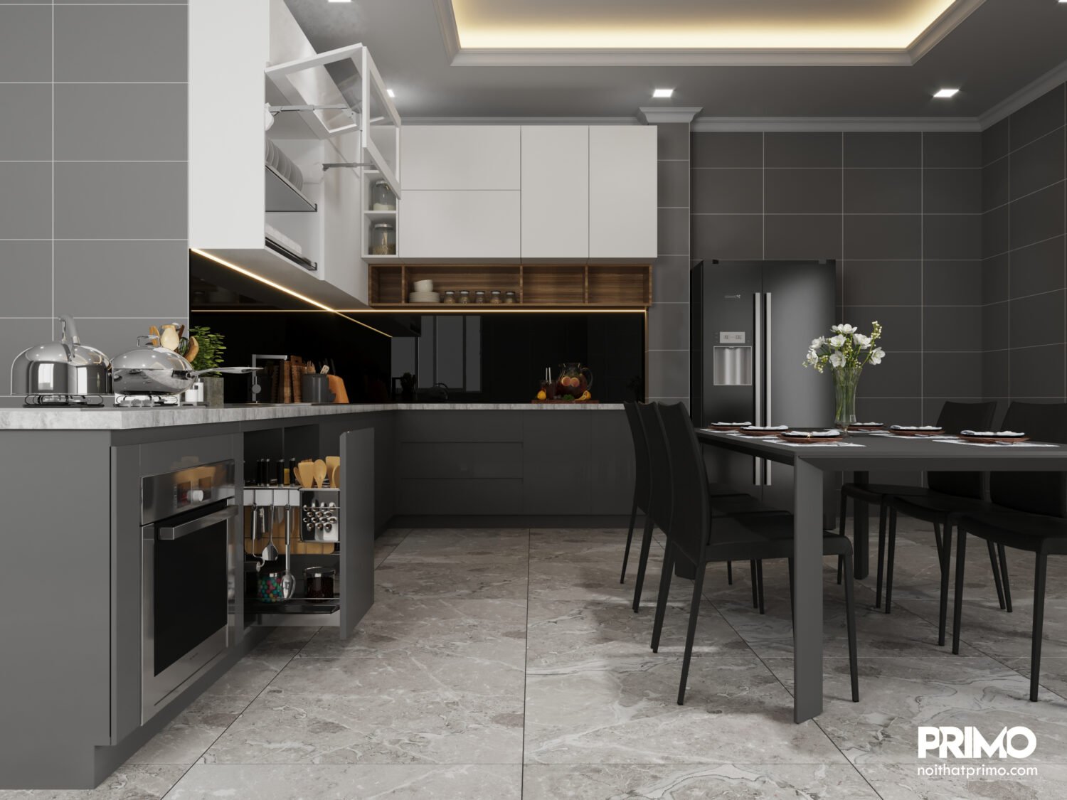Bếp sử dụng tông màu xám/đen cho hệ tủ dưới và trắng cho hệ tủ trên, tạo sự tương phản rõ rệt và hiện đại.