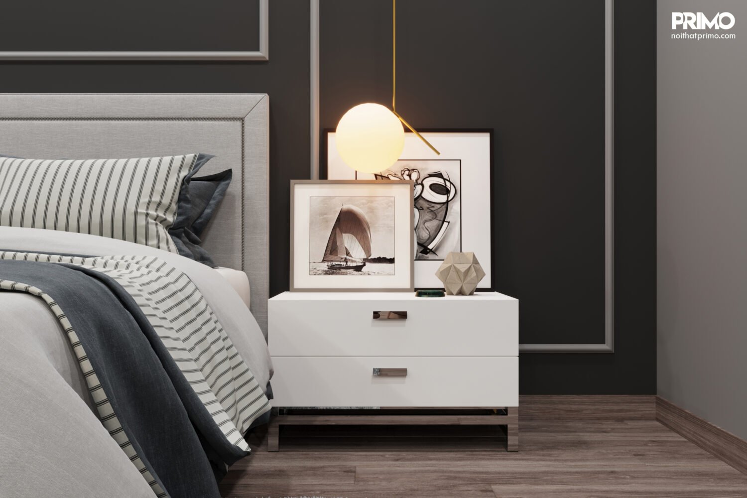 Tường đầu giường ốp panelling (phào chỉ) màu trắng, đầu giường bọc nệm xám. Thiết kế này phù hợp cho gia chủ yêu thích sự thanh lịch, cổ điển nhưng vẫn tối giản.
