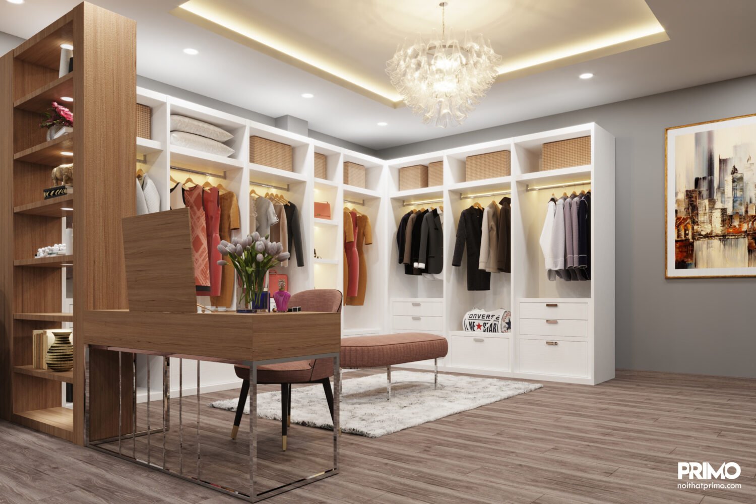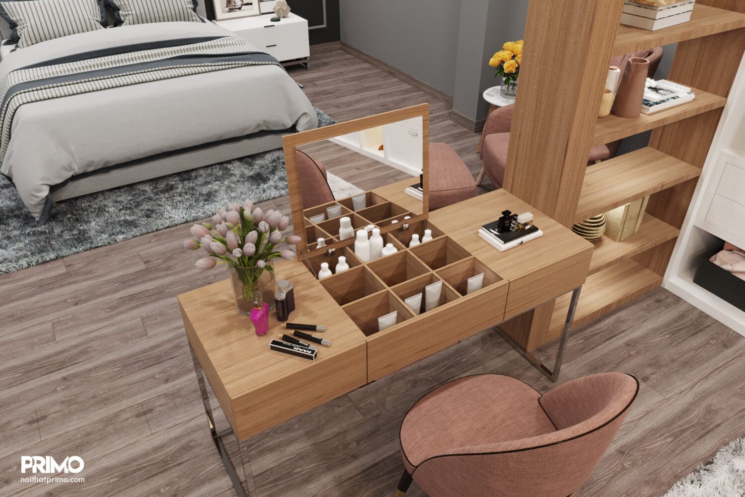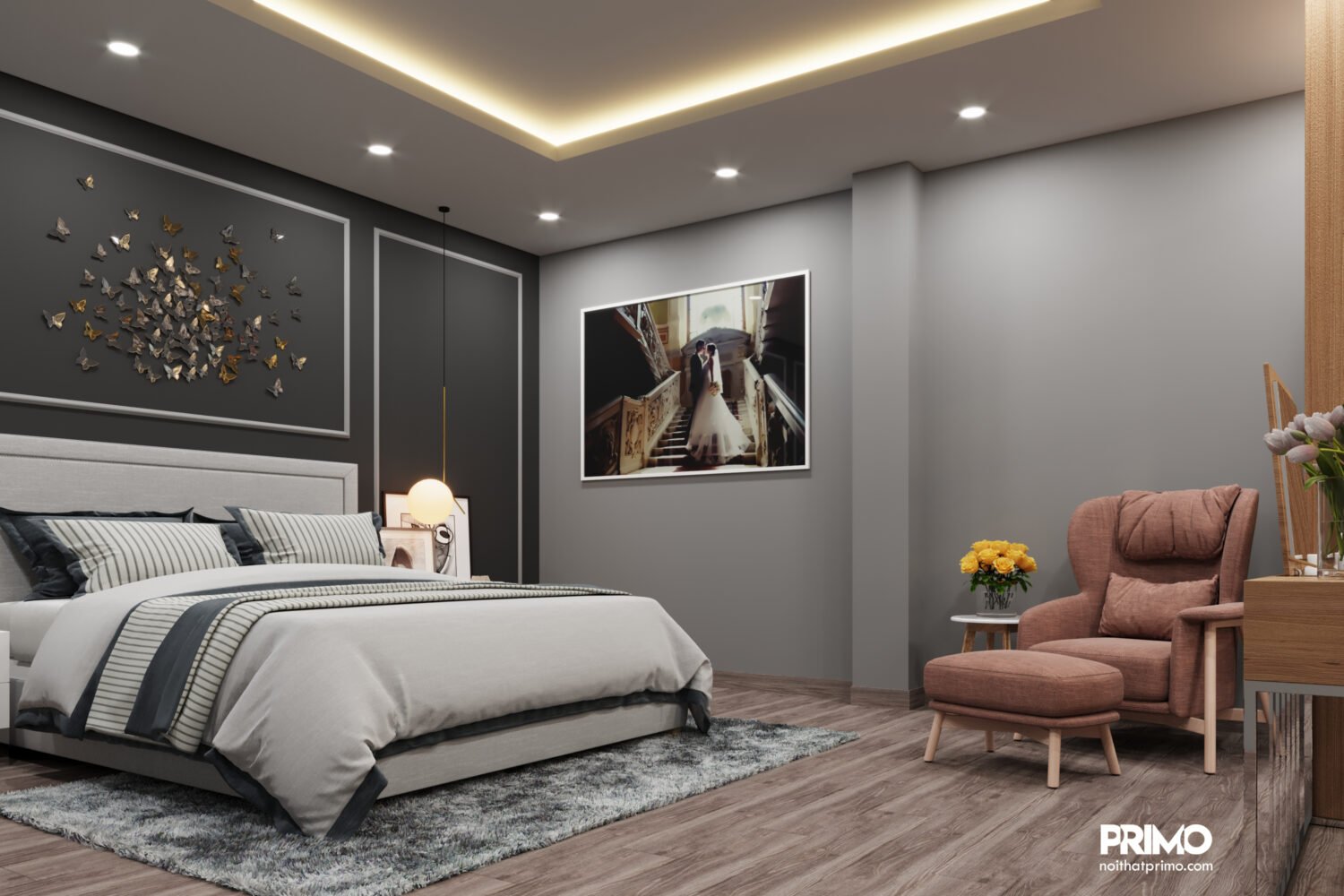Phòng ngủ chính được thiết kế như một chốn nghỉ dưỡng riêng tư, tập trung vào sự thoải mái và tính thẩm mỹ cao.