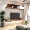 Sàn gỗ tối màu mang lại sự ấm áp và tương phản với nội thất màu xám/kem.