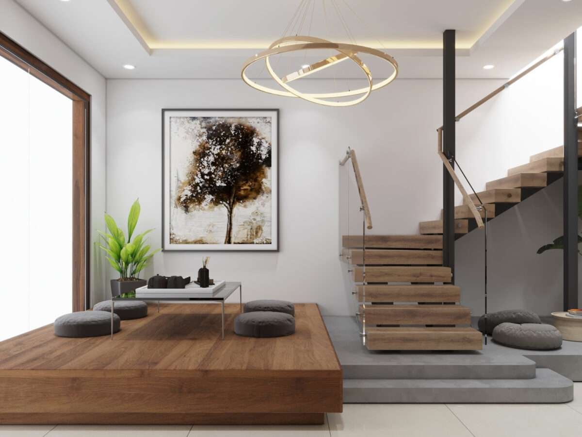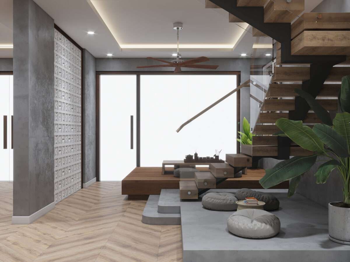 - Góc Thư Giãn Độc Đáo: Khu vực chiếu nghỉ cầu thang được tận dụng làm nơi ngồi bệt bằng bục gỗ và đệm tròn, tạo thành góc “chill” thiền định hoặc đọc sách sáng tạo, tách biệt khỏi sự ồn ào.