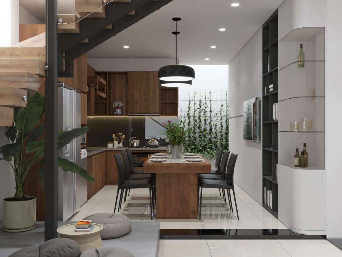 Khám phá thiết kế nội thất nhà phố, nơi sự ấm cúng của chất liệu gỗ Rustic gặp gỡ sự tinh gọn của phong cách Hiện Đại. Công trình này là minh chứng cho việc tối ưu hóa diện tích nhà phố, tạo ra một không gian sống đa chức năng, tiện nghi và tràn ngập hơi thở thiên nhiên.