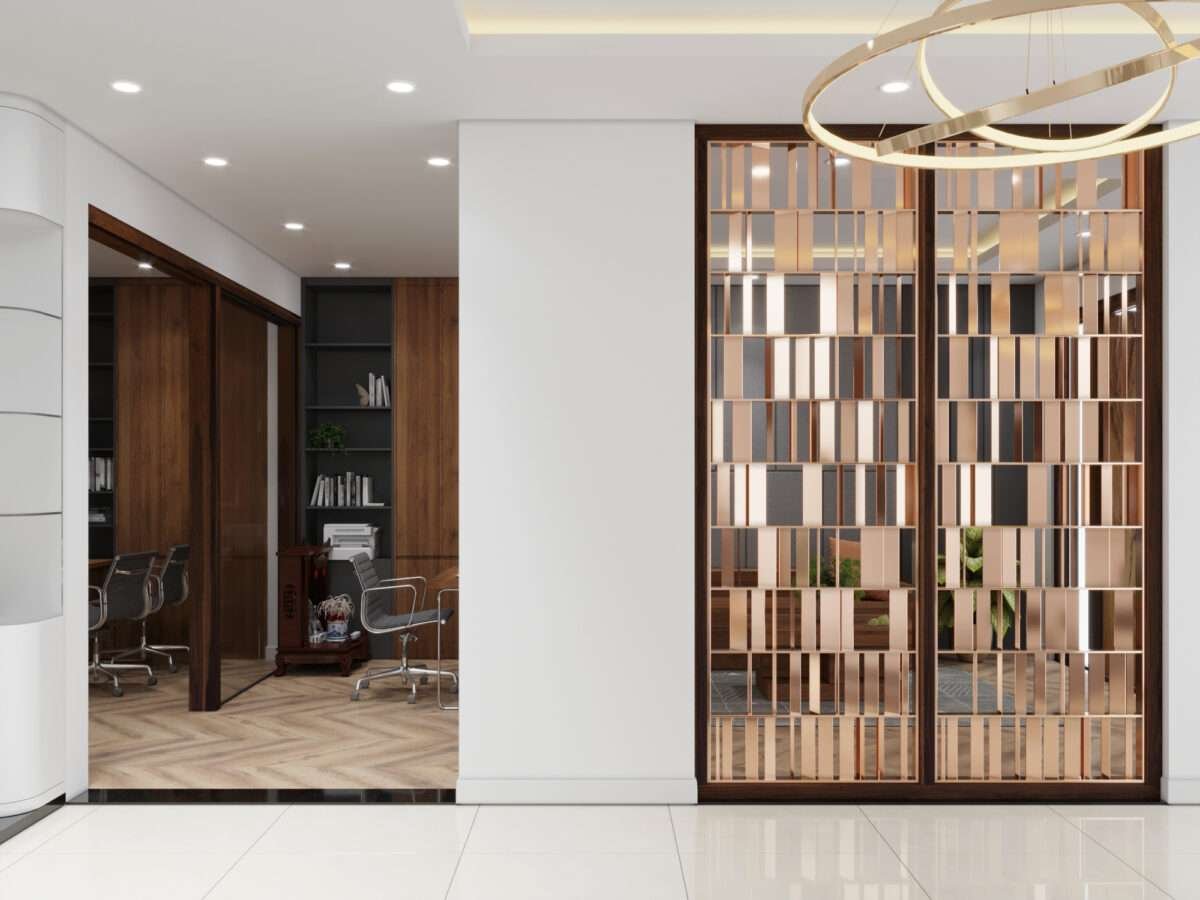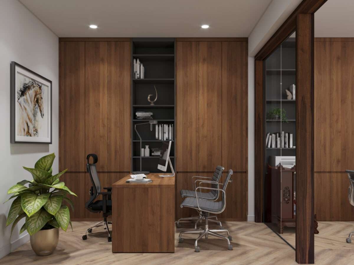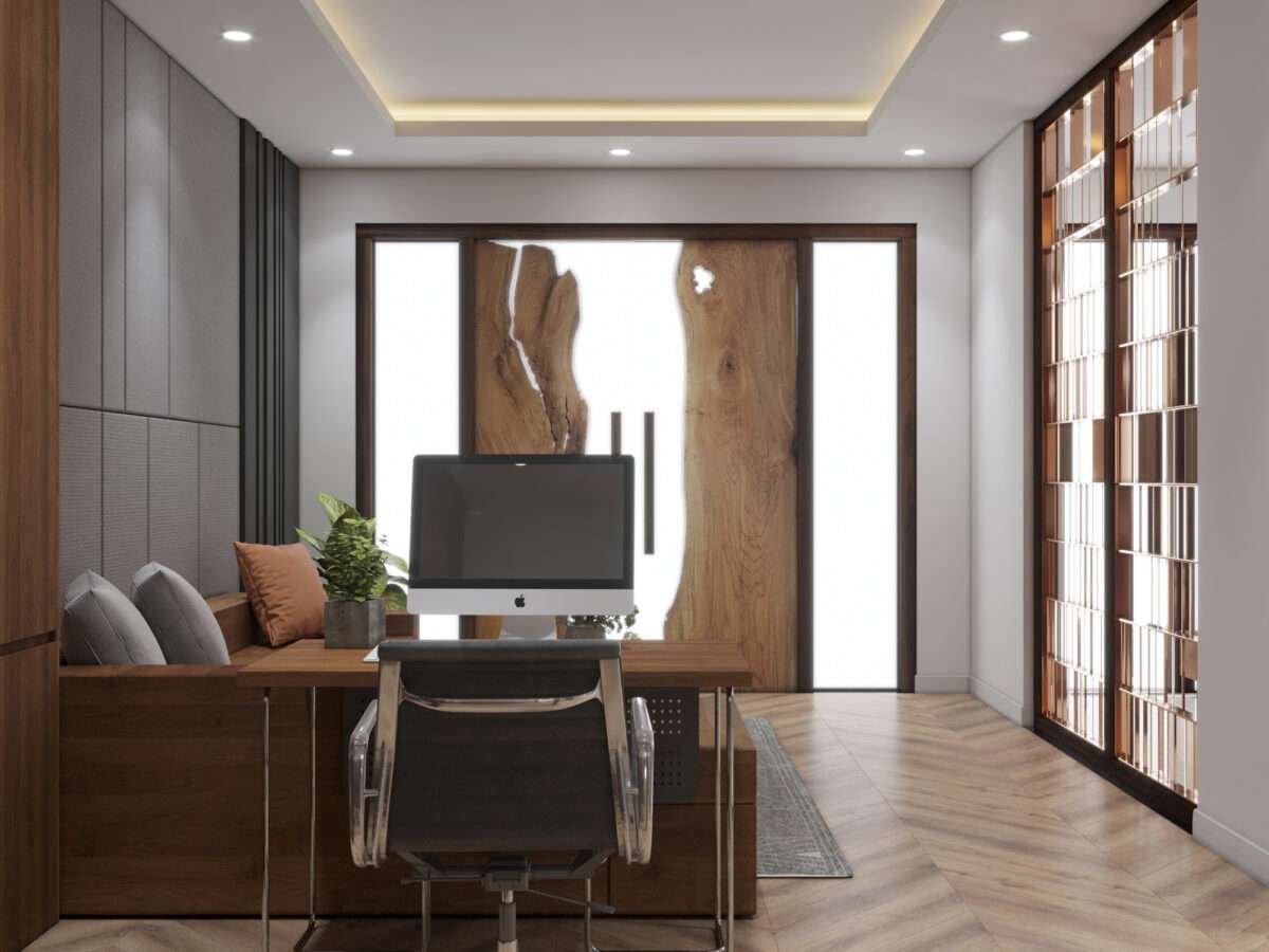 - Góc Làm Việc Thông Minh: Bàn làm việc được bố trí liền kề với hệ tủ kệ, tối ưu hóa không gian chức năng mà không làm ảnh hưởng đến tính thẩm mỹ chung.
