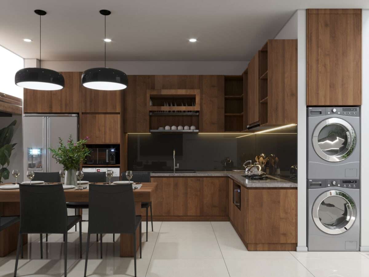 - Thiết Bị Tích Hợp: Tích hợp máy giặt/máy sấy ngay trong hệ tủ bếp, giải quyết vấn đề công năng cho nhà phố có diện tích hẹp.