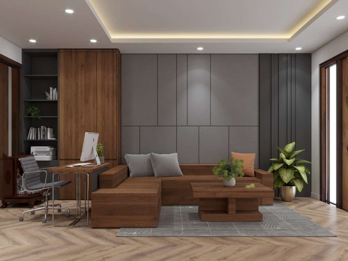 - Tường Điểm Nhấn: Tường phòng khách ốp nệm hoặc vật liệu vải dệt màu xám trung tính, tạo kết cấu êm ái, cách âm tốt và làm nền nổi bật cho tông gỗ.